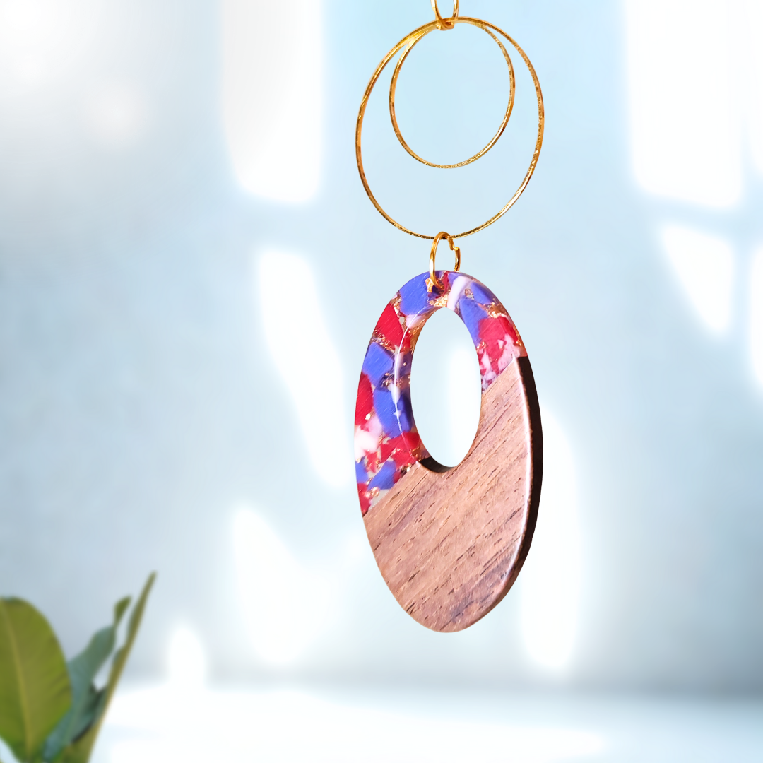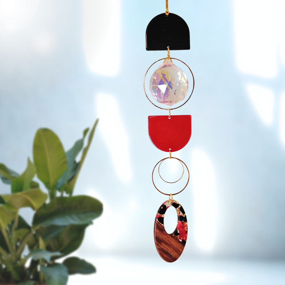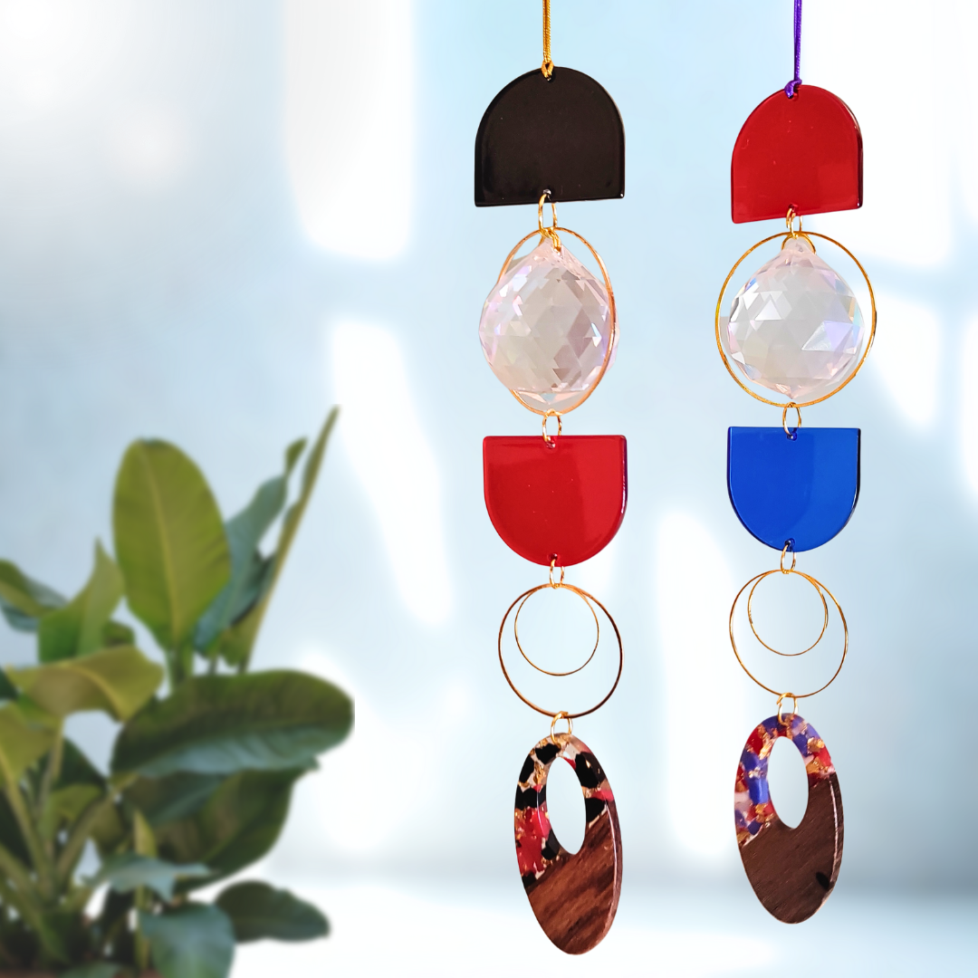 Materialien: Acrylscheiben, Metallring, Nussbaumholz mit Epoxidharz, Verbindungsösen, Nylonschnur